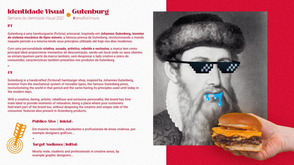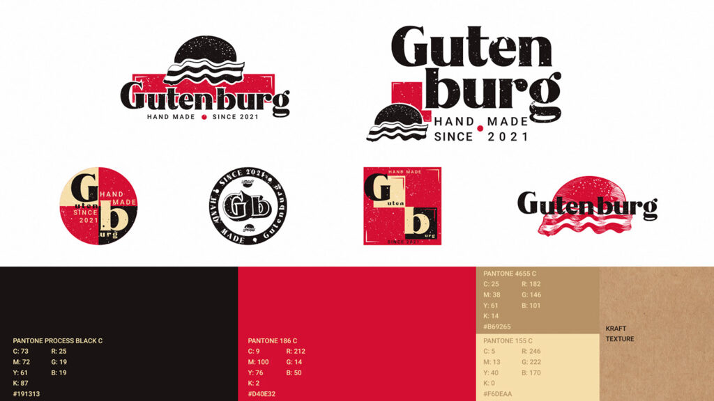 Desenvolvido para um desafio criativo do designer Marcelo Kimura, o projeto Gutenburg nasce da união entre a tradição da tipografia (Gutenberg) e a cultura do hambúrguer artesanal (Burg).